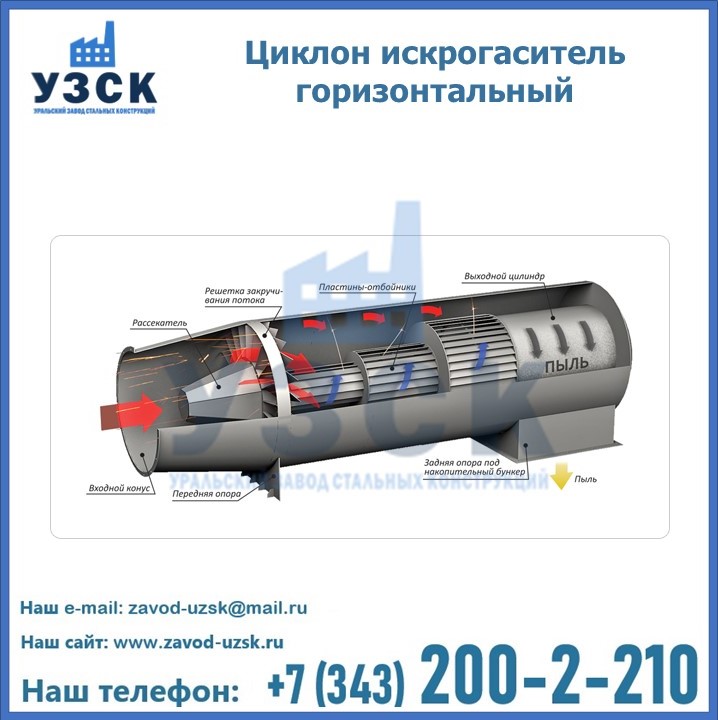 Горизонтальные циклоны-искрогасители ЦГ поставляются в Щёлково в сборке или же транспортными единицами для последующей сборки, если предназначены для работы с большими объемами.